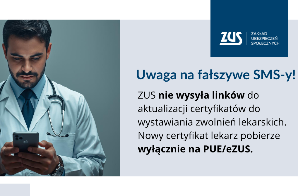 ZUS ostrzega lekarzy przed oszustami. W ostatnich tygodniach niektórzy z nich otrzymywali fałszywe SMS-y z linkiem do rzekomej „aktualizacji” certyfikatu do wystawiania zwolnień chorobowych.