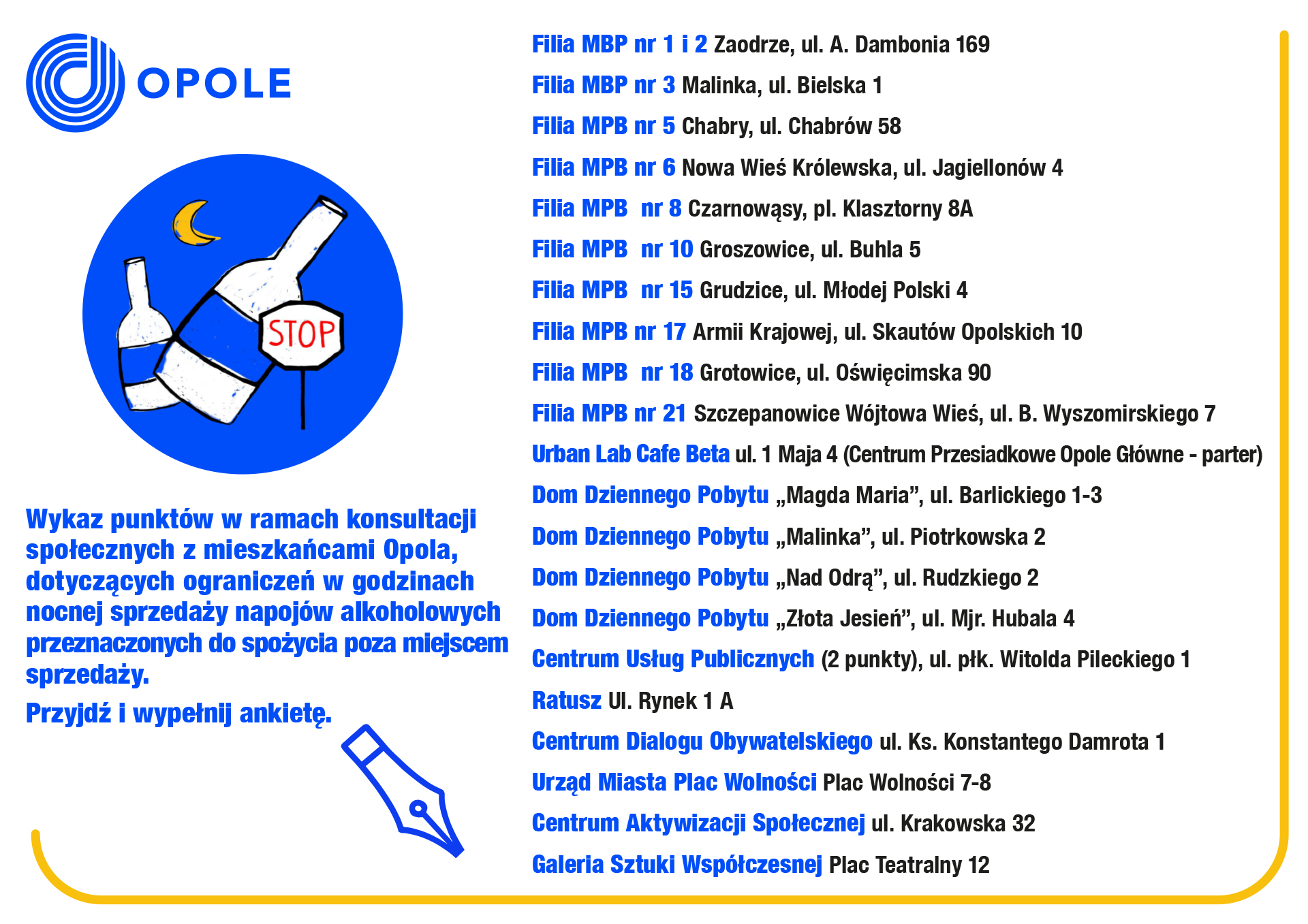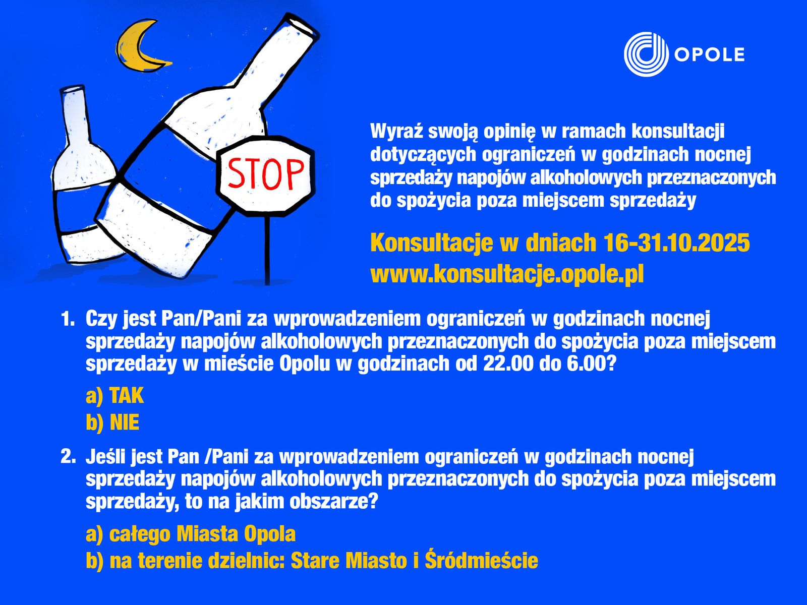 Od 16 do 31 października mieszkańcy Opola mogą wziąć udział w konsultacjach społecznych dotyczących ograniczenia nocnej sprzedaży alkoholu. Konsultacje odbywają się zarówno w punktach rozmieszczonych w dzielnicach miasta, jak i online na stronie www.konsultacje.opole.pl.